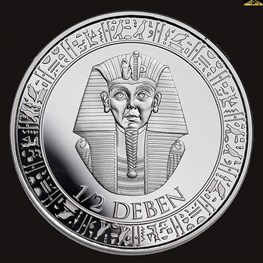 • Reverse: Displays an effigy of a pharaoh in its instantly-recognizable nemes head cloth surrounded by hieroglyphics. The round carries a denomination of 1/2 Deben.