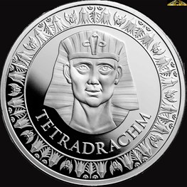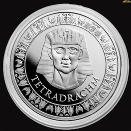 • Reverse: Depicts Ptolemy II Philadelphus, the pharaoh of Egypt during construction of the Lighthouse. The round also features a denomination of a Tetradrachm, a common currency of the time.