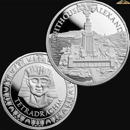 Once considered the tallest man-made structure in the world standing at least 300 feet in height, the Lighthouse at Alexandria was built by the Greek Ptolemaic Kingdom of Ancient Egypt during the reign of Ptolemy II Philadelphus around 280 BC. Sometimes referred to as the Pharos of Alexandria, the Lighthouse was constructed of stone and remained standing until three earthquakes between the years of 956 and 1323 AD tremendously damaged the structure causing this Ancient Wonder to be an abandoned before falling into complete ruin. This 1 oz Silver round features a detailed depiction of the Lighthouse and the pharaoh during the time of its construction, Ptolemy II Philadelphus. In addition to the detailed Lighthouse and pharaoh, the round also features the denomination of a Tetradrachm, a currency commonly used during the time when the Lighthouse remained standing.